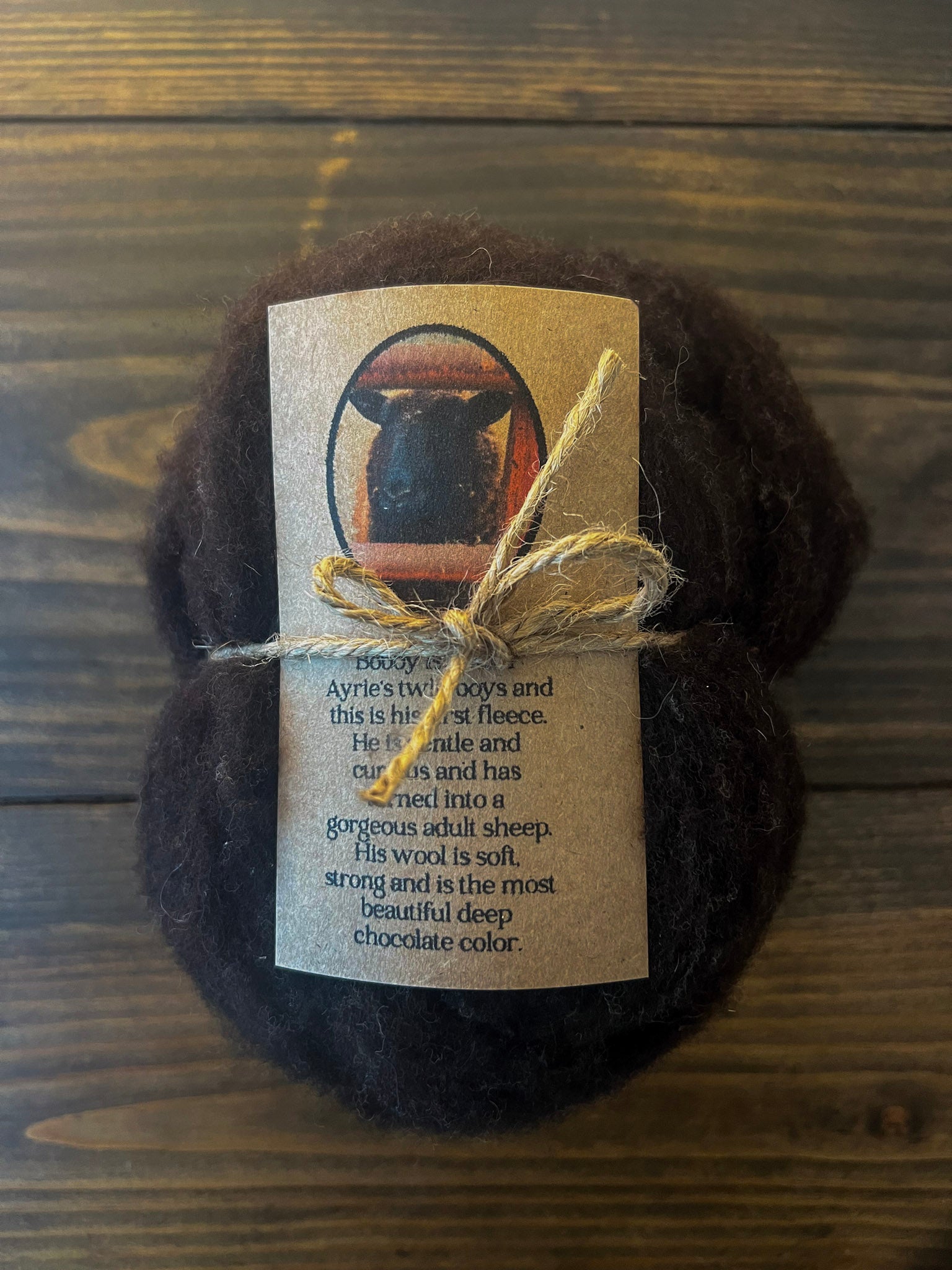 Bobby is one of Ayrie’s twin boys and this is his first fleece. He is gentle and curious and has turned into a gorgeous adult sheep. His wool is soft, strong and is the most beautiful deep chocolate color.